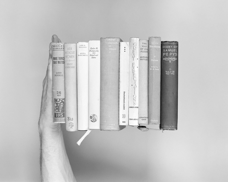 In the image we first encounter on entering the gallery, a set of ten books seem suspended in mid-air (divorced from any domestic setting) with a human hand that holds (or resists) the books, positioned at an improbable angle. The artist has a relationship with these objects but it is a relationship of questions, and absences.